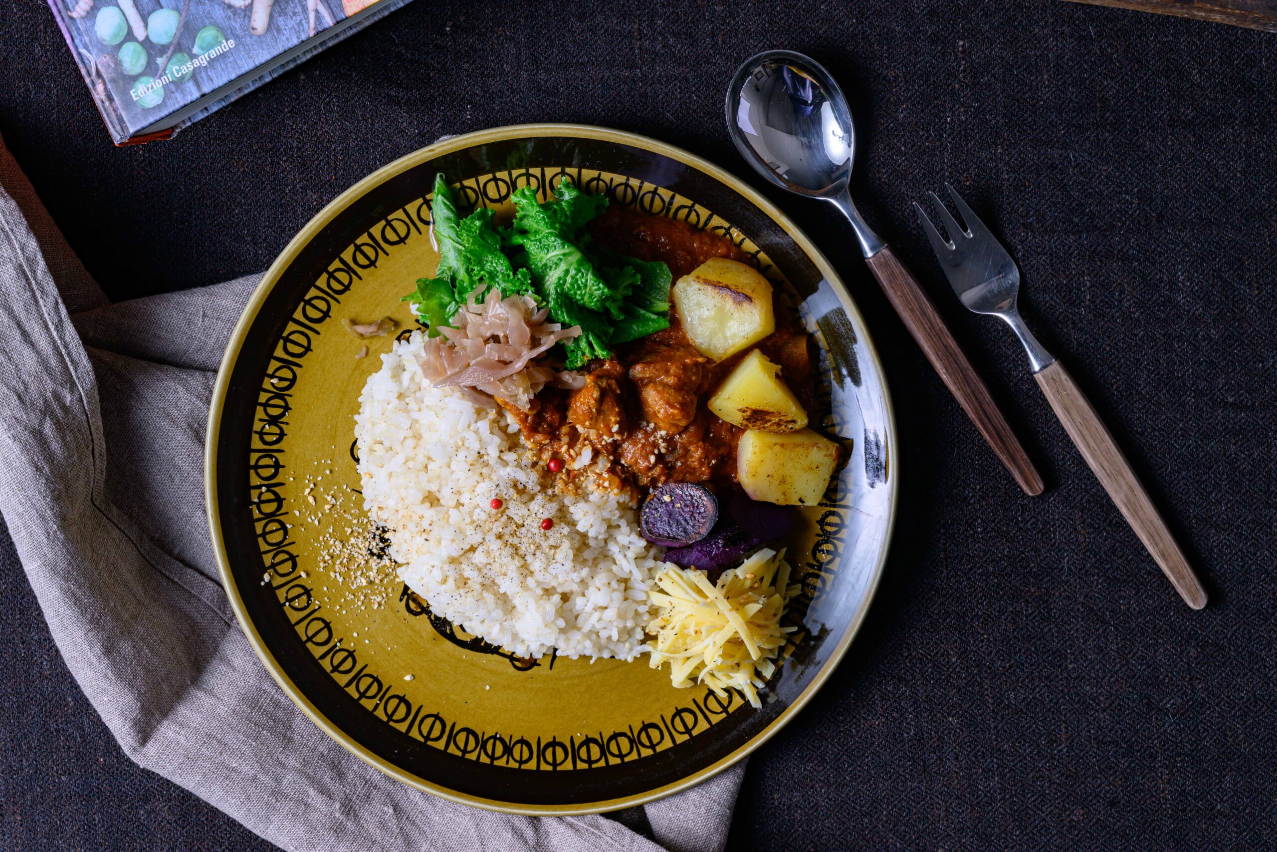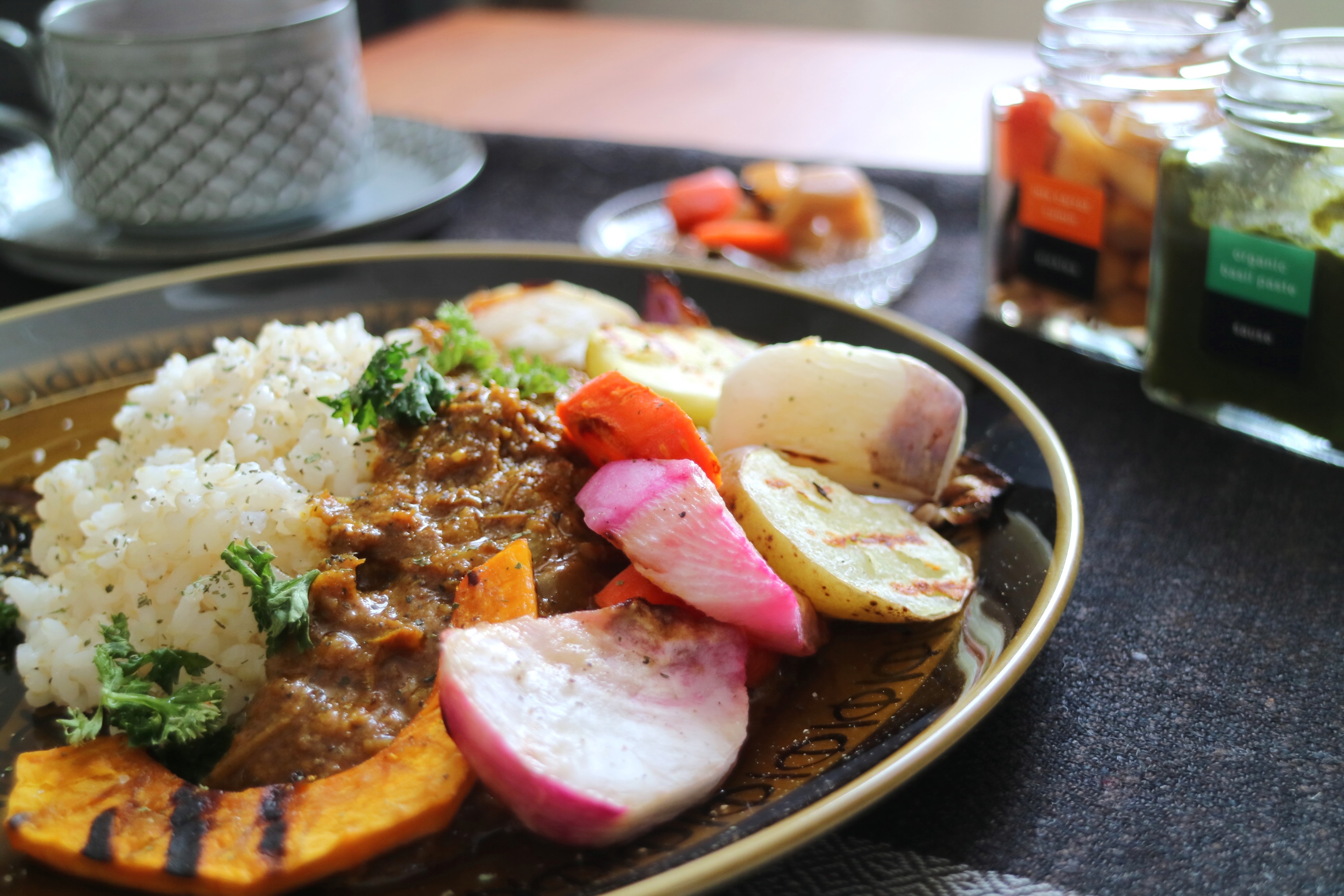 平飼い鶏はソテーしてから鶏ガラ出汁で煮込み、旨味を凝縮された後、丁寧に裂いて使用しています。日々の食卓に気軽に食べていただくことを目的にしており、辛さは中辛程度で仕上げています。たっぷりのグリル野菜と一緒にお召し上がりいただくのもオススメ。