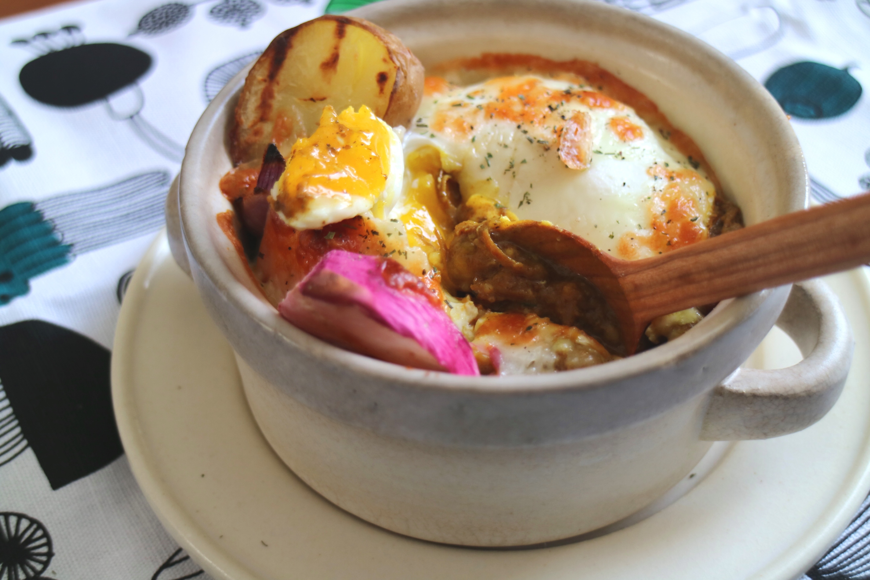 アレンジも簡単!グラタン皿にご飯を敷き、ベシャメルソース、カレー、目玉焼きを乗せれば、焼きカレーもあっという間に作れます。『ピクルス mix carrot cumin』との相性も抜群ですよ♪